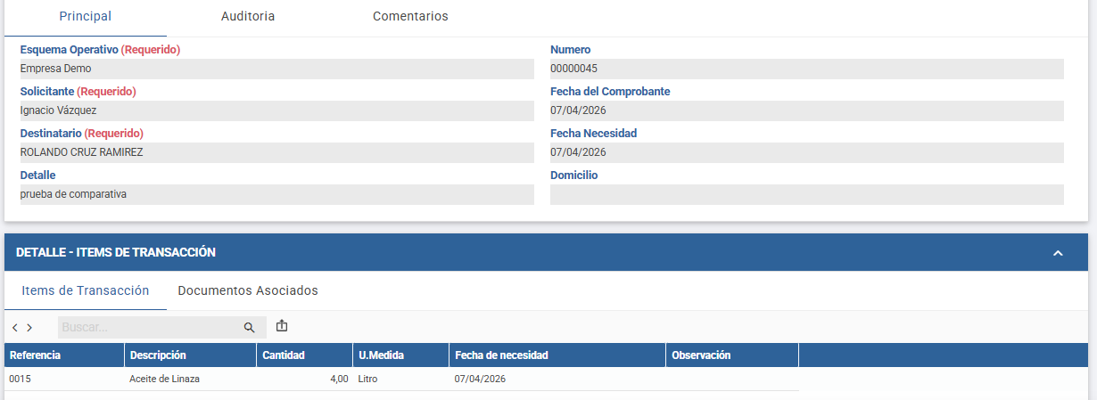 Detalle de Ítems: Se cargan los productos (ej. Aceite de Linaza), la cantidad y la fecha de necesidad