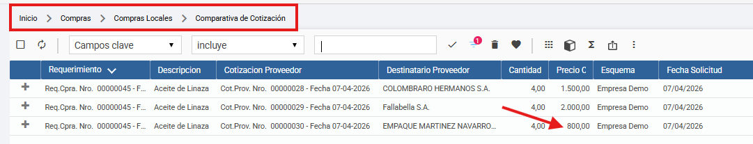 Nota: En este ejemplo, se observa que la cotización más económica corresponde a Empaque Martinez Navarro.