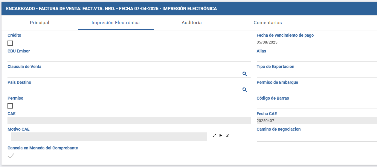 4. Generar campos en las transacciones Factura de Venta, Nota de Crédito y Nota de Débito: