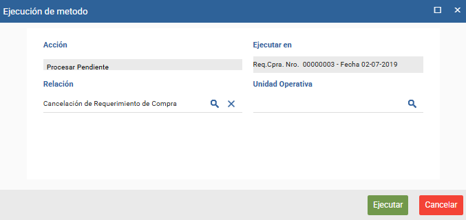 Paso 2 - Se accede a la siguiente pantalla, donde en el campo Relación, se debe informar "Cancelación de requerimiento de compra", no es necesario informar el campo Unidad operativa