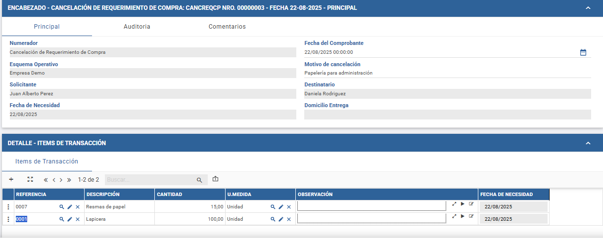 - Se puede cancelar el requerimiento de compra en su totalidad.