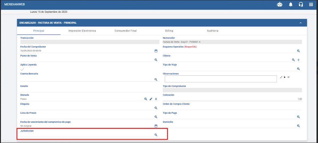 4. Verificar que el atributo se traslade automáticamente a la Factura de Venta. Imagen de ejemplo: