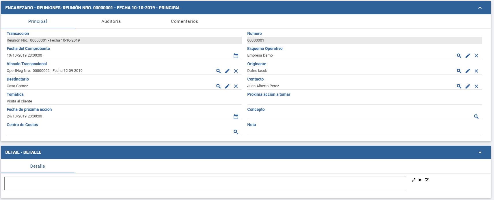 - el campo Vínculo Transaccional, seleccionando la oportunidad de negocio asociada a la reunión. Al hacerlo, se completarán automáticamente el Destinatario y Fecha de próxima acción (editable).