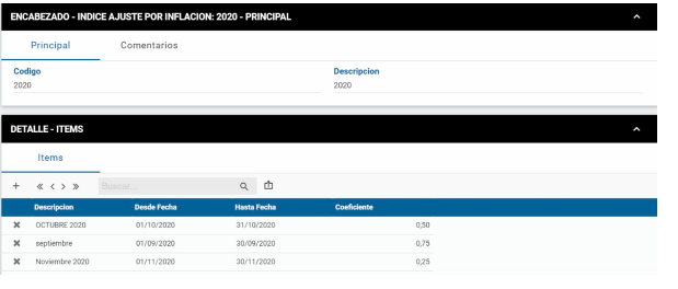 Desde nuevo se realiza la carga de los índices para cada ejercicio contable