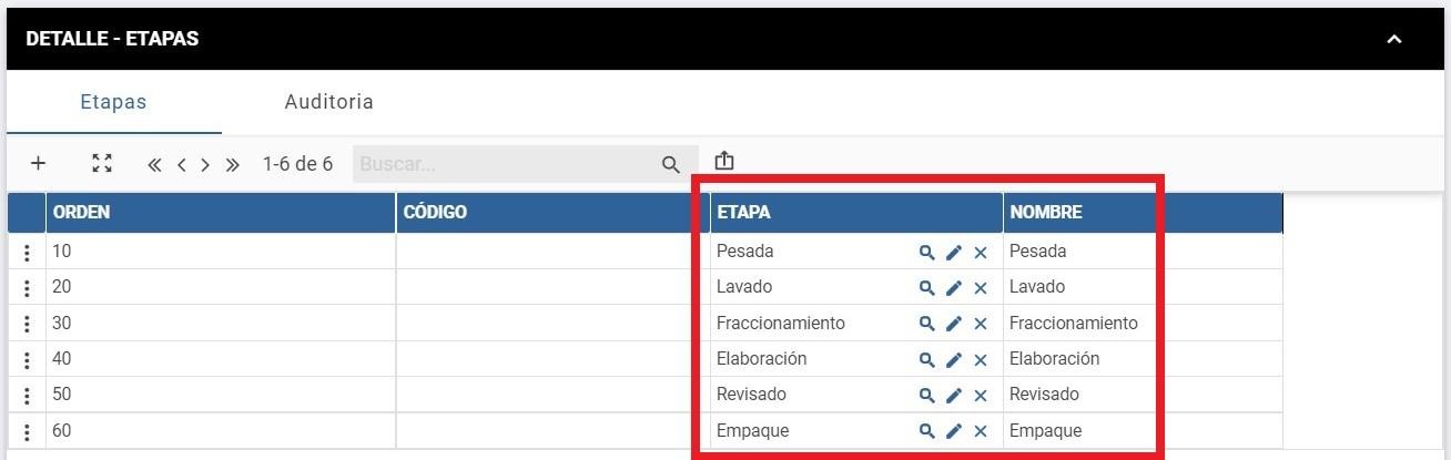 Etapas del proceso: permitirá, a nivel de componentes, seleccionar las etapas que correspondan, como se muestra en este detalle al que se accede con la herramienta Lupa: