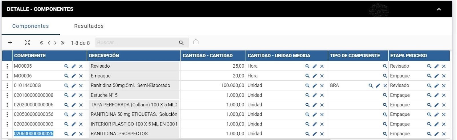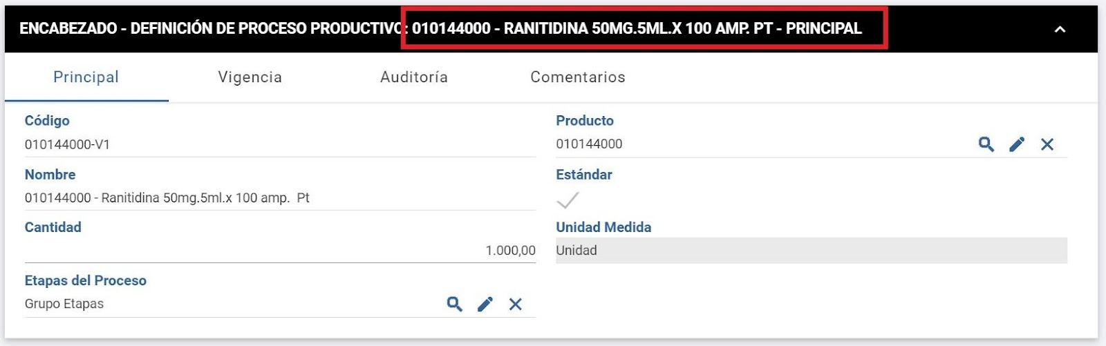 Los datos de cabecera corresponden al producto que es resultante del proceso.