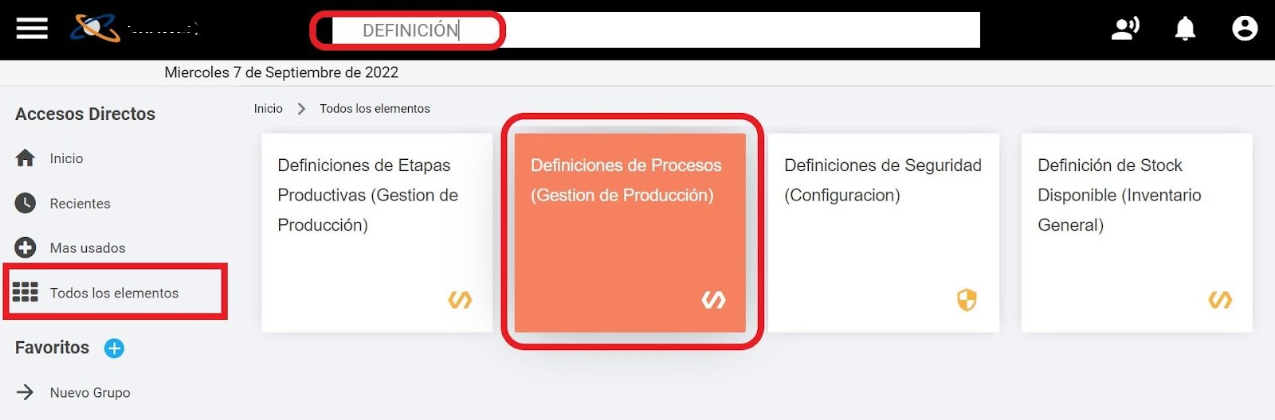 En el buscador de la barra superior, ingresar la palabra ‘definición’ , ‘definiciones’ o ‘procesos’.