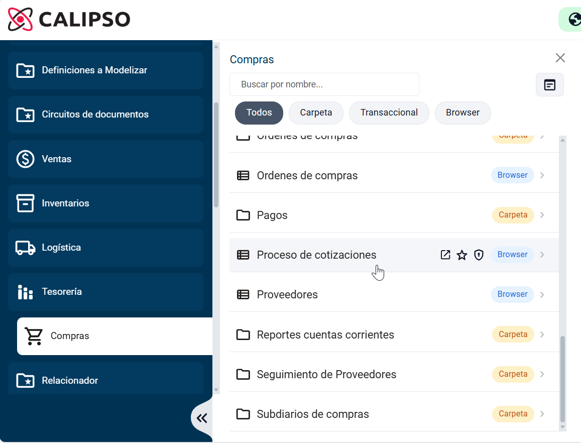 El proceso se ejecuta desde Compras → Proceso de cotizaciones, centralizando todas sus etapas dentro de un mismo flujo guiado por workflow.