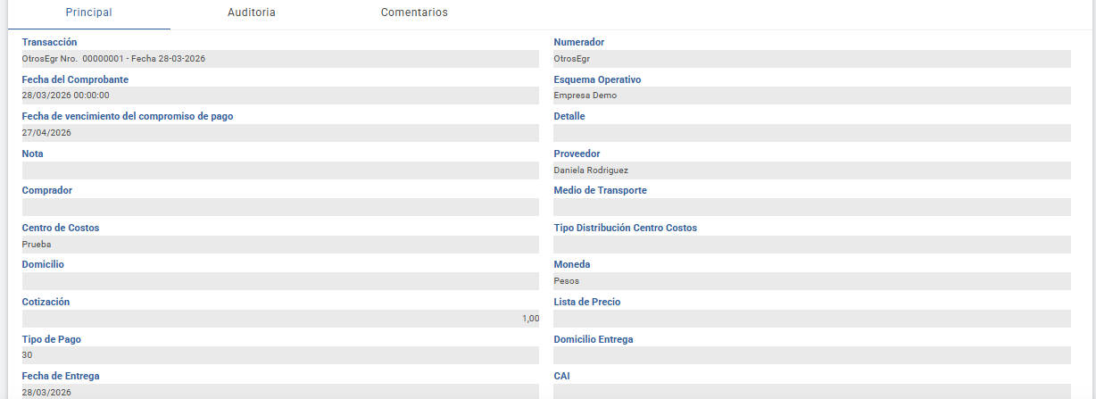 - Sí. Dado que la transacción de Otros Egresos genera un compromiso de pago con una fecha de vencimiento definida en su encabezado , el sistema lo integra automáticamente en el Cash Flow proyectado. Esto permite prever la salida de fondos en la fecha estipulada, al igual que una Factura de Compra.