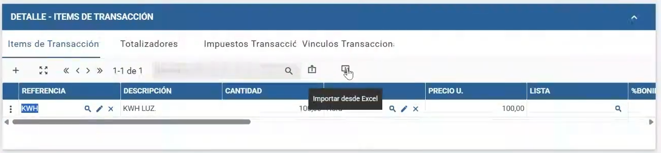 En la grilla de ítems de todas las transacciones que permitan carga de registros (por ejemplo, facturas de compra o cobranzas). Disponible en registros con estado: Abierto o Pendiente.